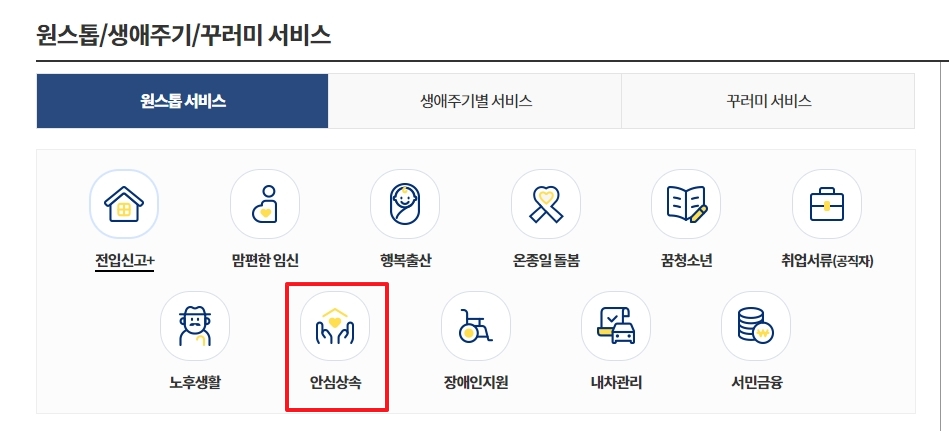 2. 상단 메뉴에서 민원서비스를 선택한 후 원스톱 서비스 화면에 진입하면 하위 메뉴 목록 중 안심상속을 클릭하여 사망자 재산 조회 통합 신청 페이지로 이동할 수 있습니다.