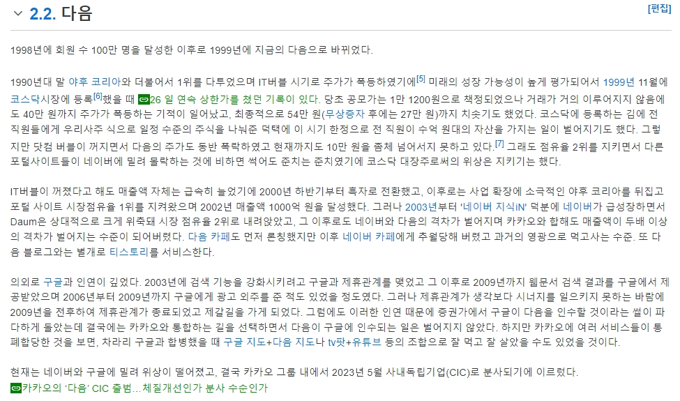 4. 카카오와의 합병 이후에는 다음 브랜드 하에서 운영되던 여러 서비스가 카카오 브랜드로 통합되거나 일부 종료된 내역을 확인할 수 있습니다.