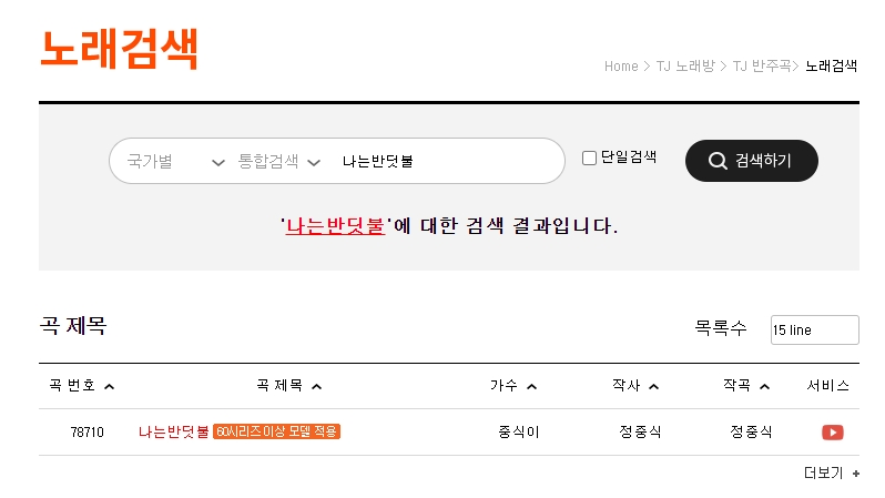 4. 예시로 ‘나는반딧불’을 검색해보았습니다. 이 곡은 금영에는 없었지만 태진 노래방에서는 바로 결과를 확인할 수 있었습니다. 기기마다 수록 곡이 다를 때가 많으니, 미리 검색해두면 현장에서 바로 노래방을 즐길 수 있어 유용합니다.