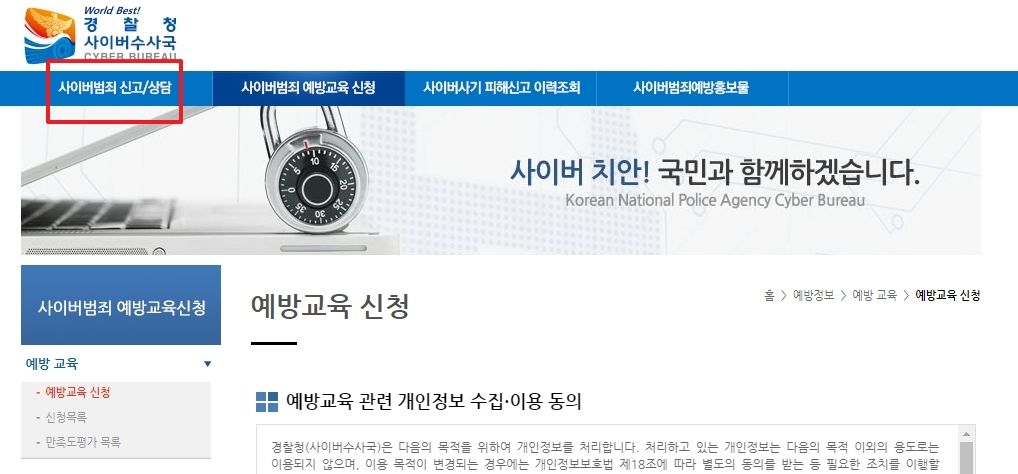 2. 상단 메뉴 바에서 사이버범죄 신고/상담 항목을 찾으시고, 마우스를 가져가서 클릭해 주세요. 글씨가 파란색으로 바뀌면 제대로 선택된 것이니, 클릭 후 나타나는 세부 메뉴에서 신고 페이지로 넘어갑니다. 메뉴 위치가 헷갈릴 때는 메뉴바 아래에 작은 화살표 아이콘을 참고하세요.