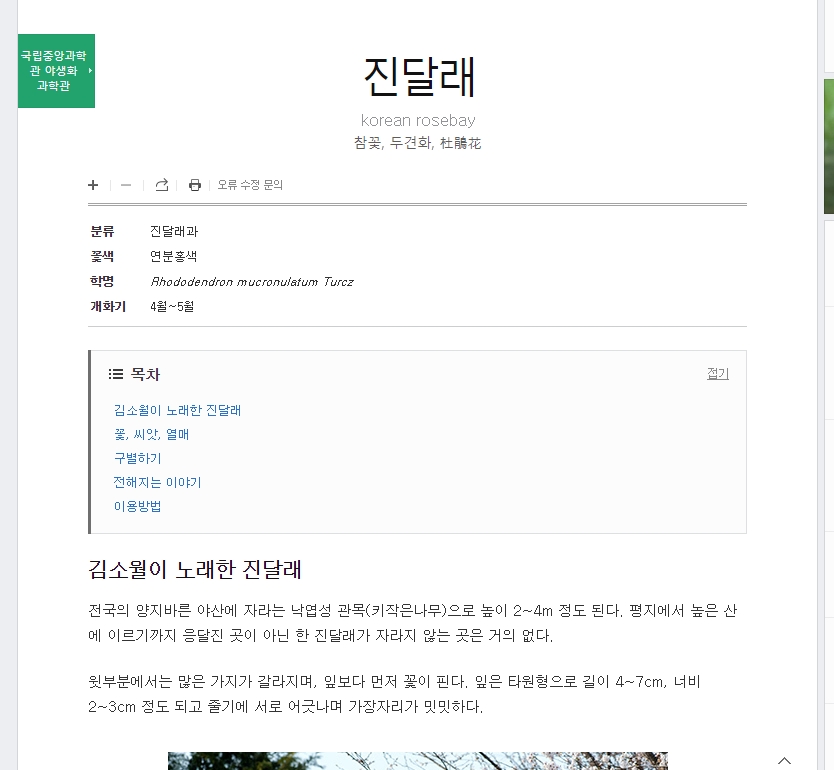 계절과 장소에 따라 친숙하게 볼 수 있는 꽃마리, 코스모스, 갈대, 자주달개비, 동백, 산수유 등이 잘 정리되어 있어요. 각각의 꽃이 가지는 특징과 생태 정보도 함께 확인할 수 있답니다.
