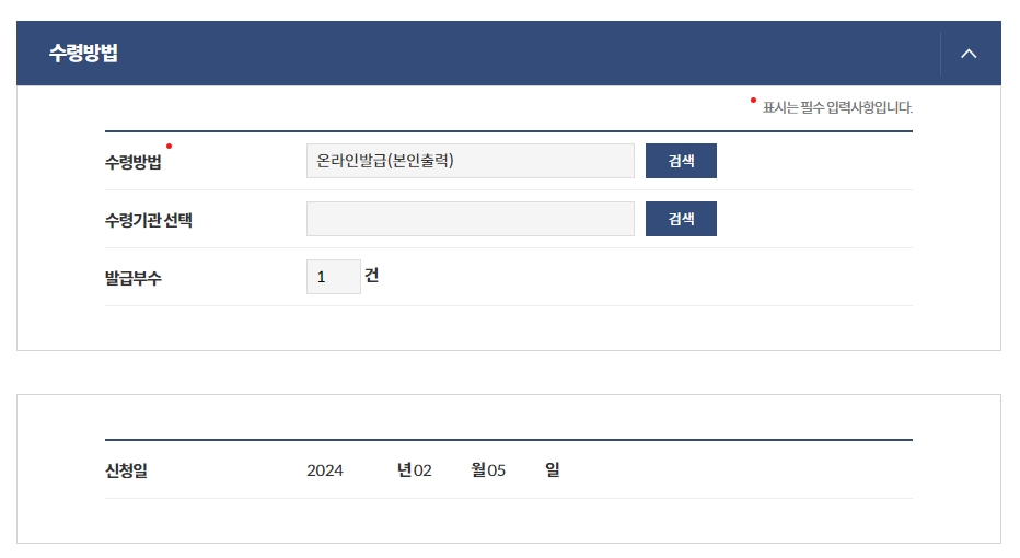 문서 수령 방법을 선택하고 신청 정보를 최종 확인한 뒤 신청을 완료하면 됩니다. 수령 기관 지정도 가능합니다.