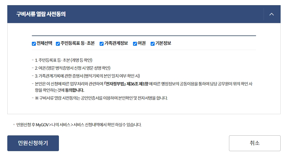 구비서류 열람 동의는 기본으로 설정되어 있으므로 그대로 두고 민원신청을 완료하면 끝입니다. 몇 분 안에 문서를 받을 수 있어 매우 빠르고 편리합니다.