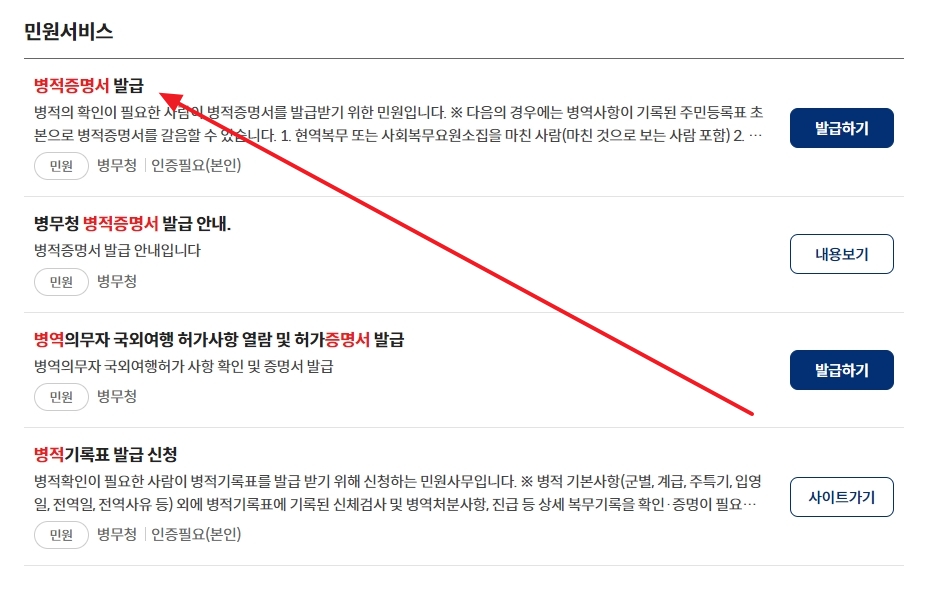 먼저 검색창에 '병역증명서'라고 입력한 후 결과 중 '병적증명서 발급' 항목을 선택합니다. 이 화면에서는 병역사항이 포함된 증명서를 온라인으로 신청할 수 있습니다.