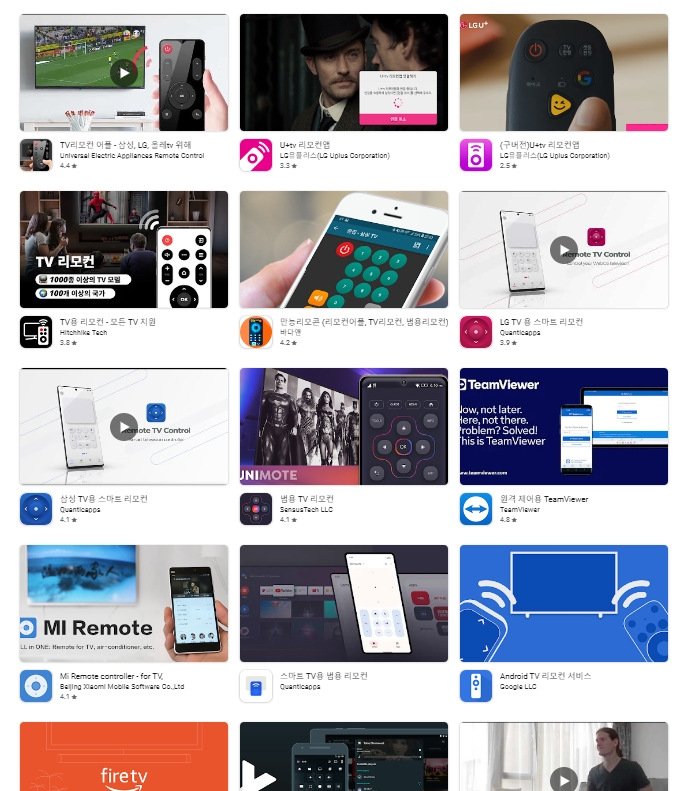 4. 여러 가지 어플 중에서 U+tv 같은 특정 서비스와 연동된 어플보다는 tv 리모컨이라고 적힌 단순한 어플을 선택하면 됩니다. 선택할 때는 리뷰나 별점도 참고하면 좋고요, 저는 개인적으로 다운로드 수가 많은 어플을 고르는 편이에요. 아무래도 많은 사람들이 사용하는 것이 안정적일 확률이 높으니까요.