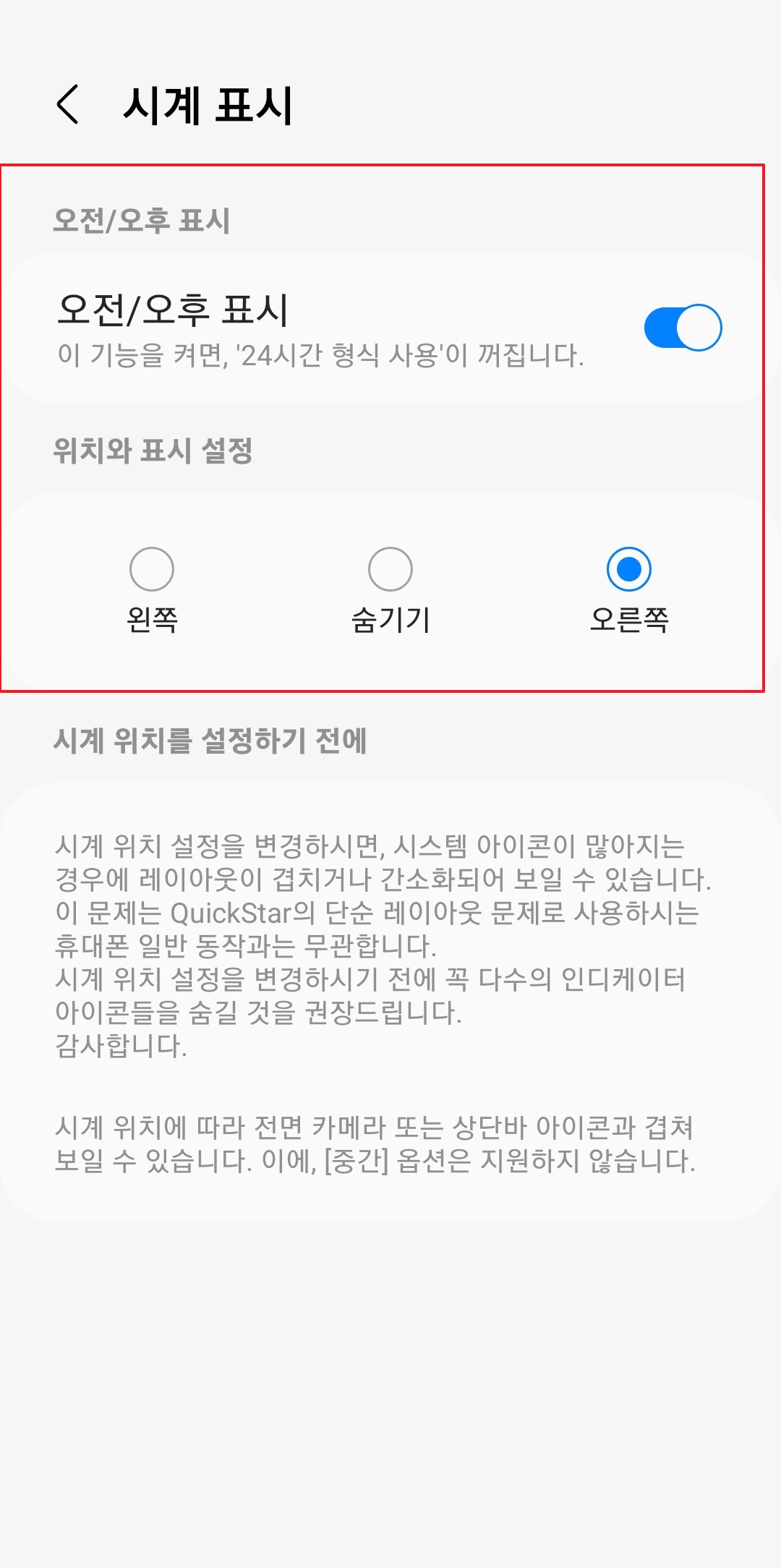 시계 표시 옵션을 통해 원하는 형식으로 시간 표시 방식을 바꿀 수 있으며, 위치를 조정해 화면 디자인과 어울리도록 설정할 수 있습니다. 설정을 마친 뒤 화면을 벗어나도 변경 내용이 자동 적용됩니다.