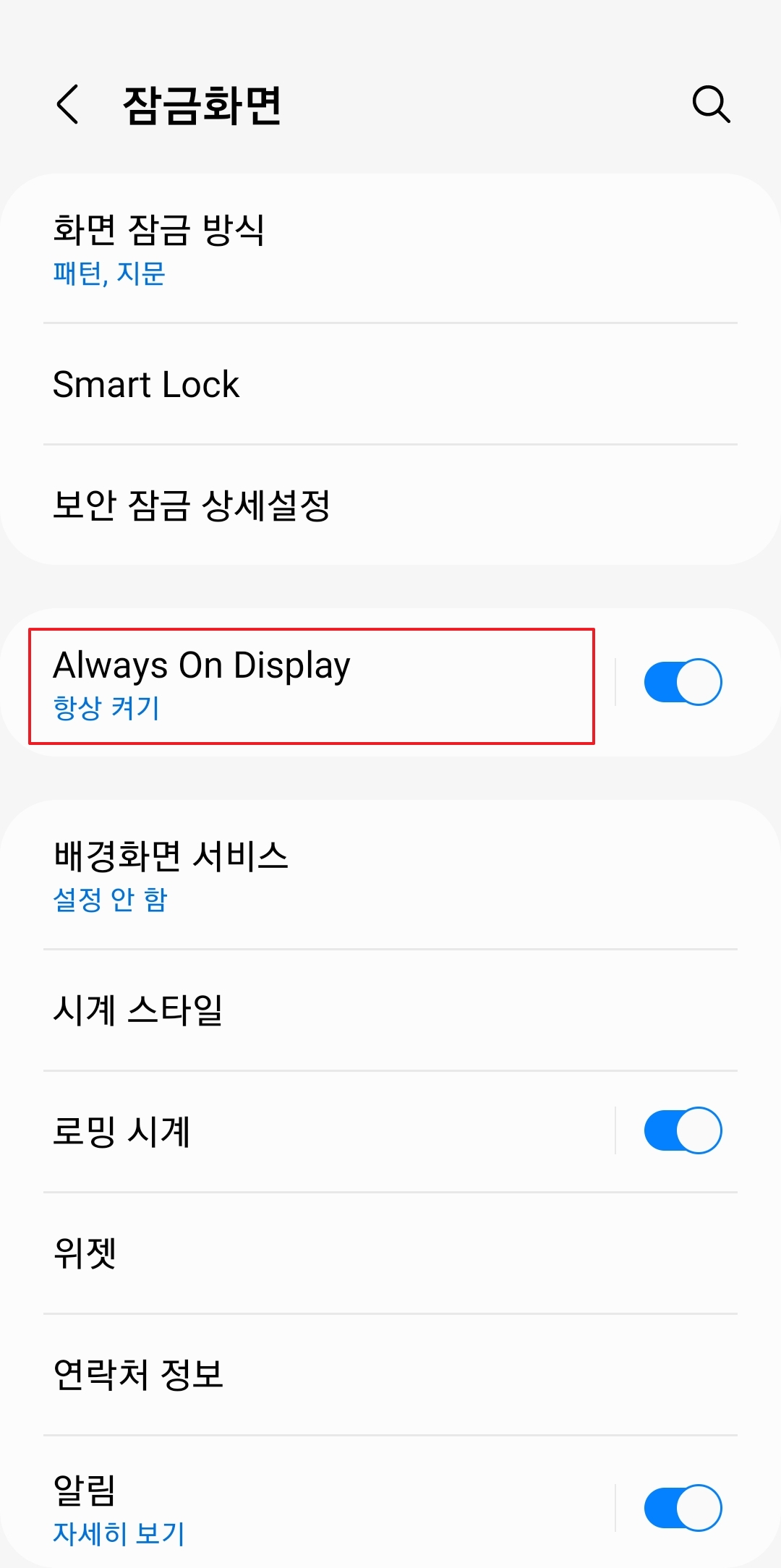 잠금화면 메뉴에 들어가면 'Always on Display' 항목을 확인할 수 있습니다. 이 기능을 활성화하면 화면이 꺼진 상태에서도 시계가 표시되어 화면을 터치하거나 버튼을 누르지 않아도 시간을 확인할 수 있습니다.