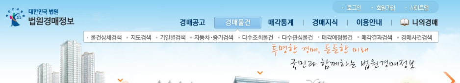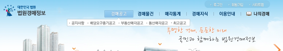 대법원 법원경매정보 홈페이지는 매각 공고부터 부동산·자동차 물건 검색, 매각 통계, 이용 안내, 경매 지식 등 경매 참여에 필요한 모든 정보를 한곳에서 제공하여 누구나 쉽고 편리하게 활용할 수 있습니다.