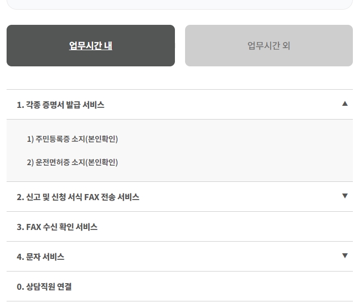 구성도에서 각종 증명서 발급 서비스, 신고 및 신청 서식 FAX 전송 서비스, FAX 수신 확인 서비스, 문자 서비스, 상담직원 연결 등의 항목을 확인할 수 있습니다. 이를 통해 다양한 서비스에 접근할 수 있습니다.