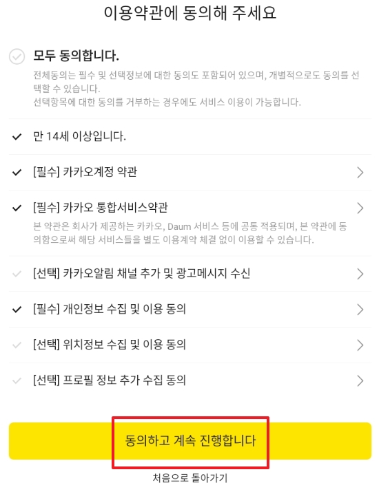 5. 약관 동의 화면으로, 필수 체크 항목만 선택한 뒤 '동의하고 계속 진행합니다' 버튼을 누르는 과정을 보여줍니다. 필요에 따라 선택 항목을 추가할 수 있습니다.