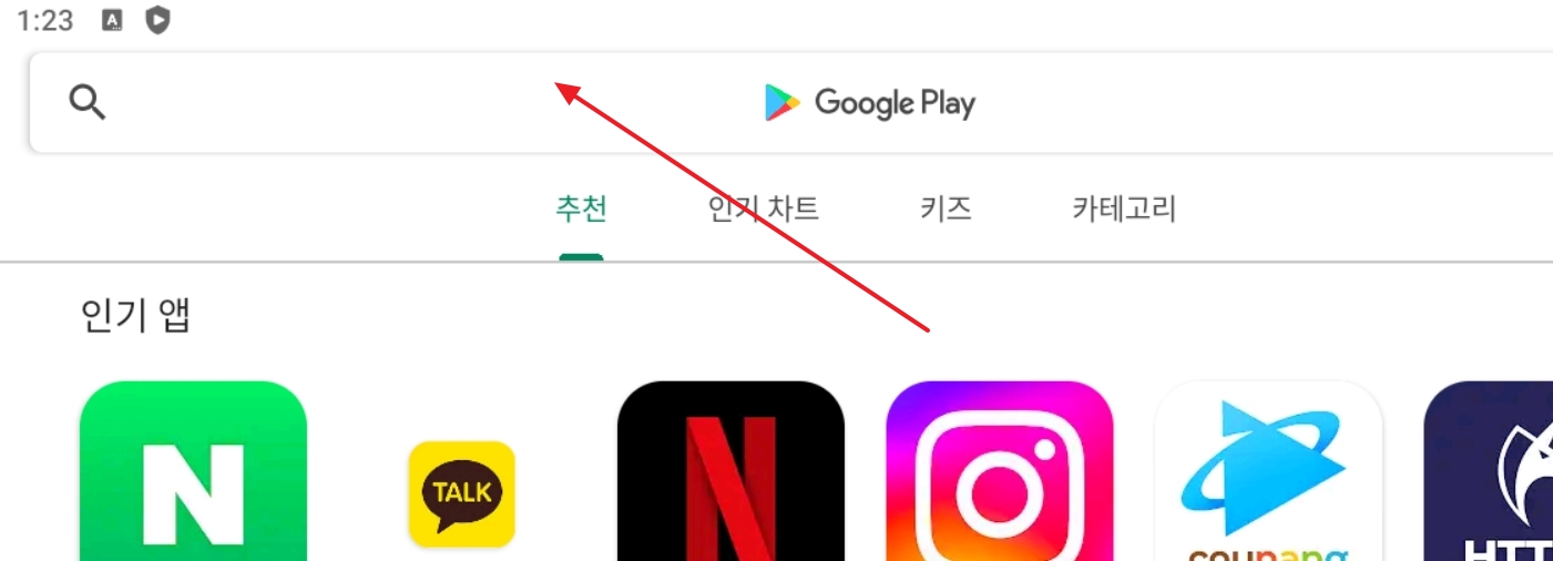 1. 플레이스토어 상단의 검색창을 터치하고 '카카오톡'을 입력해 원하는 앱을 찾는 화면을 담고 있습니다. 이때 공식 로고를 꼭 확인하여 올바른 앱인지 판별해야 합니다.
