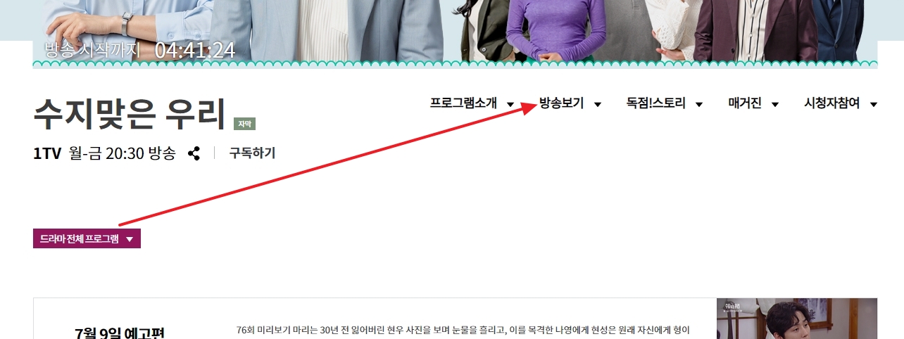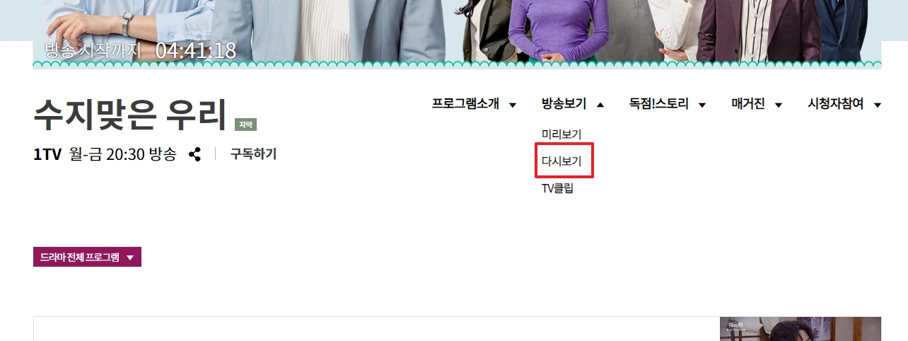 4. 드라마 상세 페이지의 상단 메뉴에서 방송보기를 클릭하면 하위 메뉴에 다시보기가 나타납니다 다시보기 메뉴를 선택하면 편성표별 회차 목록이 표시되어 원하는 회차를 바로 선택할 수 있습니다.