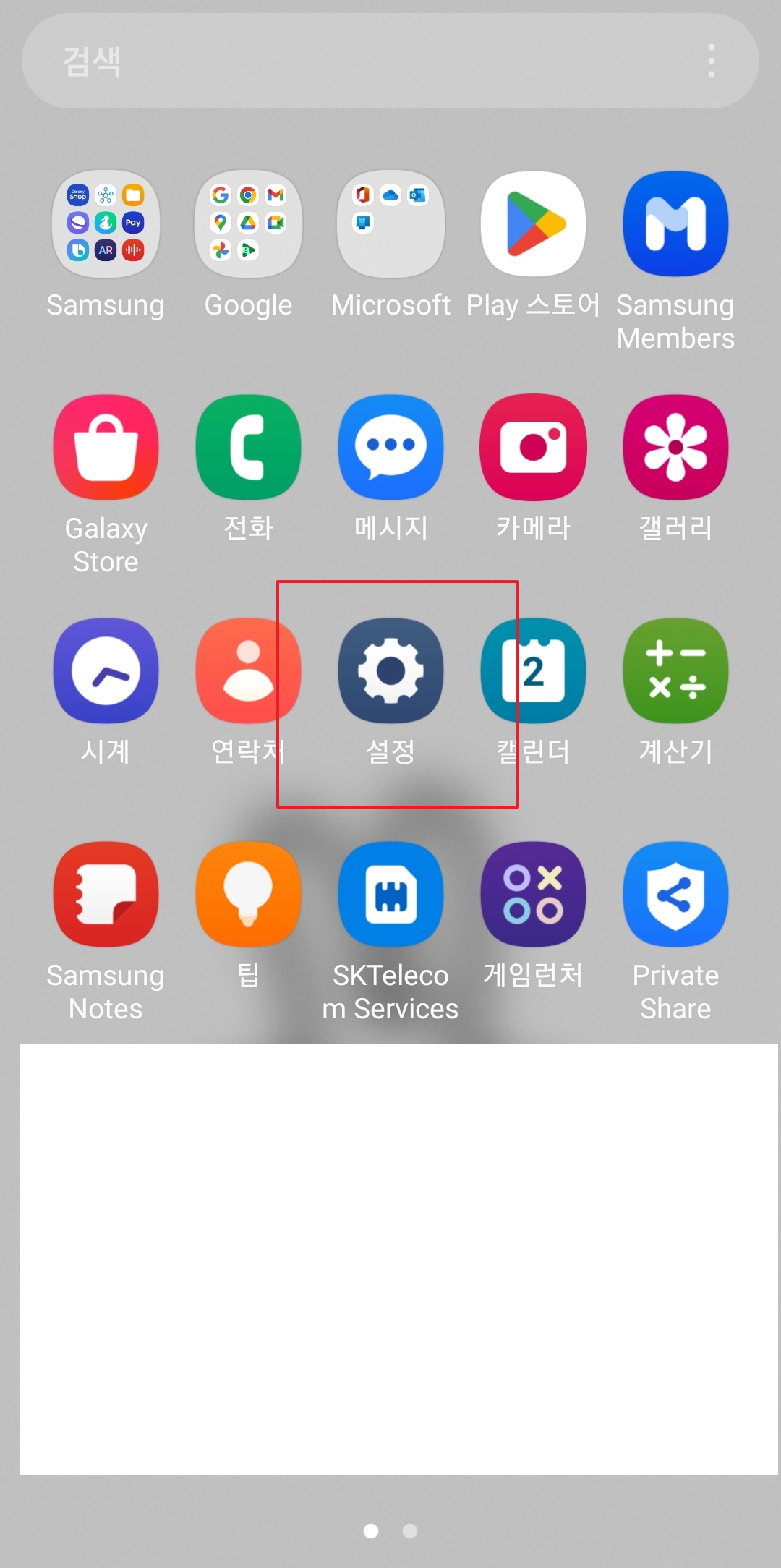 3. 점 세 개짜리를 누르면 작은 창이 하나 뜨면서 여러 가지 글자들이 보일 텐데요. 다른 건 일단 신경 쓰지 말고 우리는 '설정'이라고 쓰여있는 글자를 찾아서 눌러주면 됩니다. 보통 톱니바퀴 모양 아이콘이랑 같이 있으니까 찾기 더 쉬울 수도 있어요. 여기가 바로 전화에 관한 모든 것을 바꾸는 곳이에요.