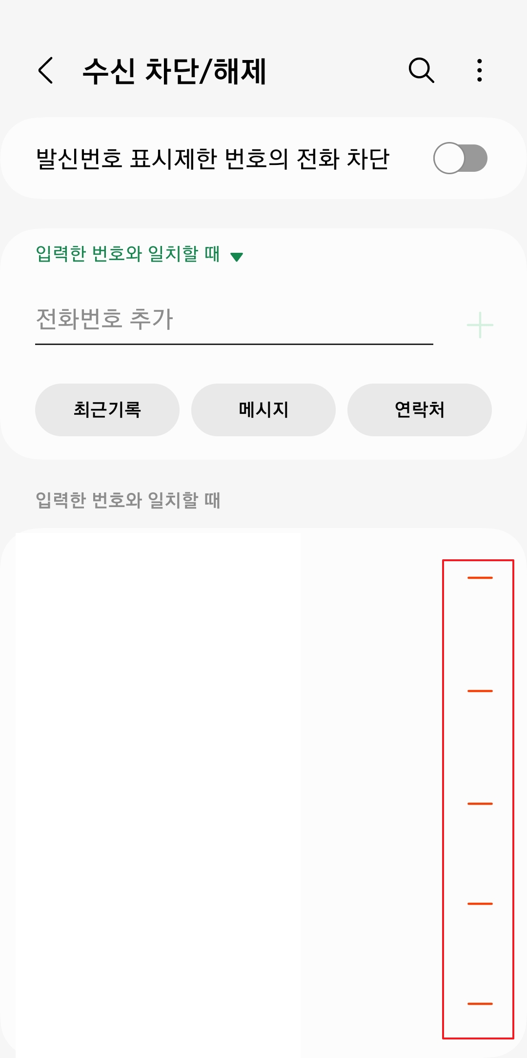 5. 드디어 마지막 단계에요. 여기에 보면 내가 차단했던 번호들이 쭉 나올 거에요. 여기서 내가 실수로 차단했거나 다시 통화하고 싶은 번호를 찾으세요. 그리고 그 번호 오른쪽에 있는 빨간색 동그라미에 빼기(-) 표시가 된 버튼을 누르면 끝나요. 이걸 누르는 순간 바로 차단이 풀리고 그 번호로 오는 전화를 다시 받을 수 있게 되는 거랍니다. 정말 쉽죠?