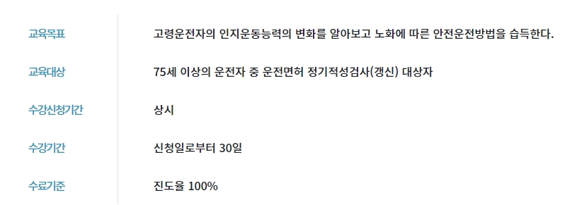 교육목표는 고령운전자의 인지운동능력의 변화를 알아보고 노화에 따른 안전운전 방법을 습득하는 것입니다. 교육대상은 75세 이상의 운전자 중 운전면허 정기적성검사(갱신) 대상자입니다. 수강신청기간은 상시이며, 수강기간은 신청일로부터 30일입니다. 수료기준은 진도율 100%입니다