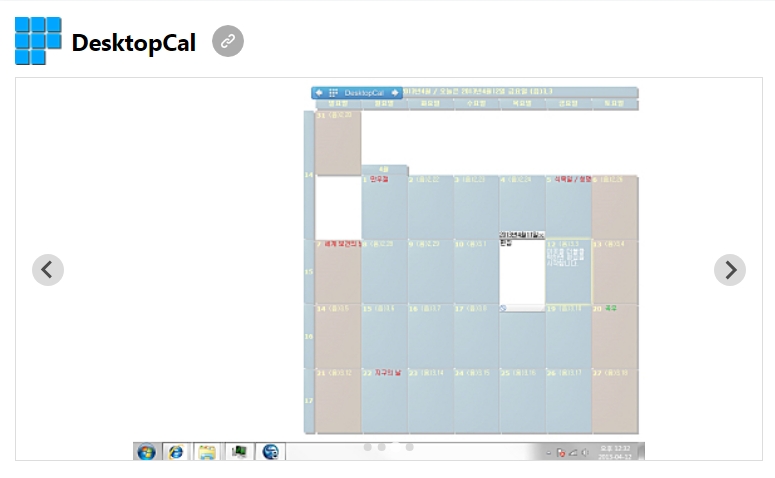 검색 결과에 나온 데스크탑칼(DesktopCal) 프로그램을 마우스로 눌러주세요. 그러면 이 프로그램에 대한 자세한 설명이 나오는 페이지로 넘어가게 될 거예요. 여기서는 프로그램이 어떤 기능을 가지고 있는지, 다른 사람들은 어떻게 평가했는지 같은 정보들을 미리 볼 수 있어서 설치하기 전에 한번 훑어보는 것도 좋은 방법입니다.