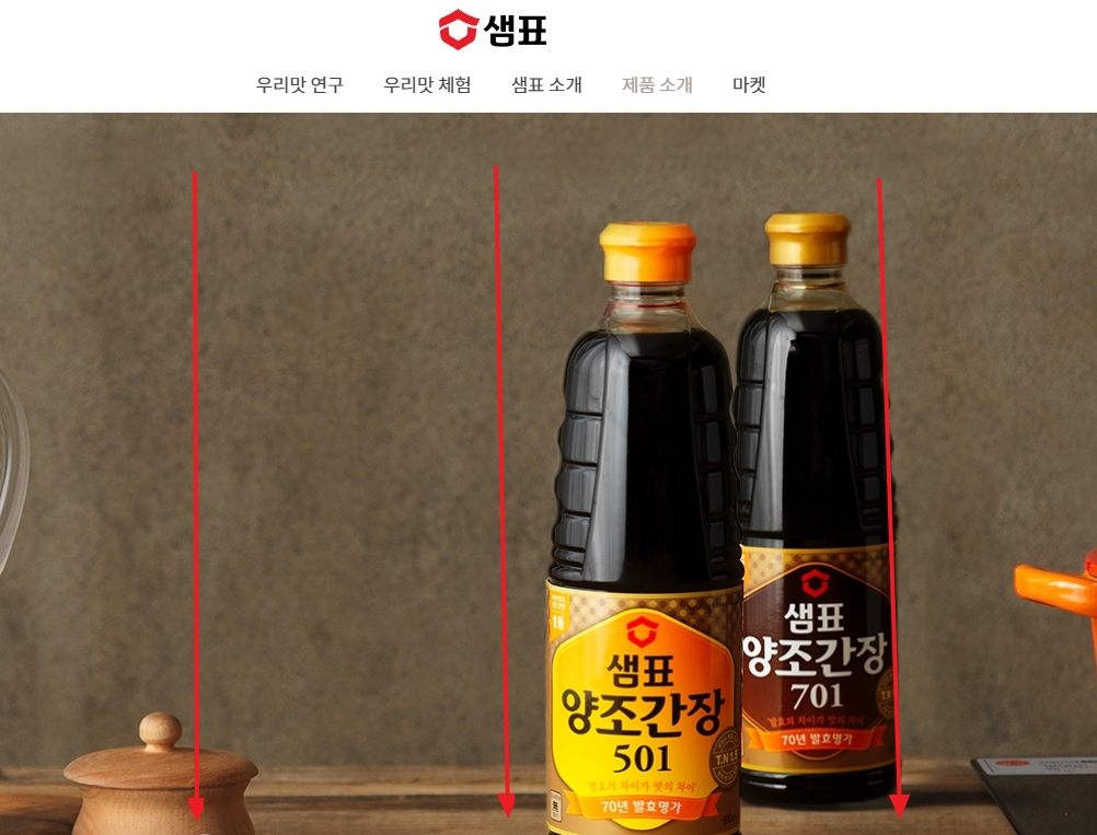 상단의 메뉴에서 제품소개를 클릭한 후 샘표간장을 선택합니다.