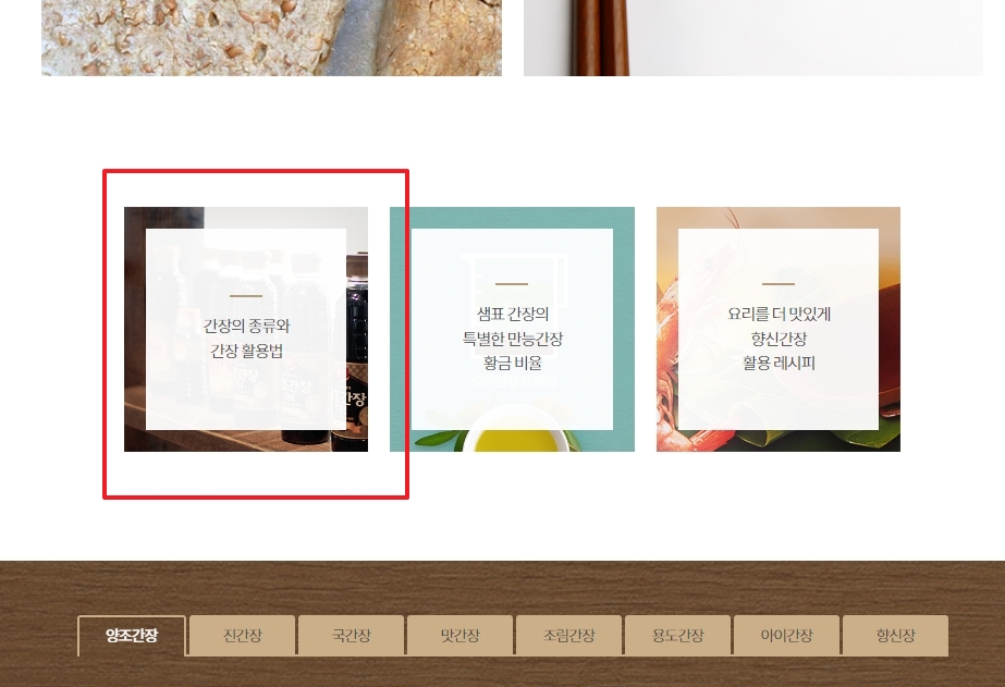 페이지가 이동하면 화면 아래로 내려서 간장의 종류와 간장 활용법 메뉴를 찾아 클릭합니다.
