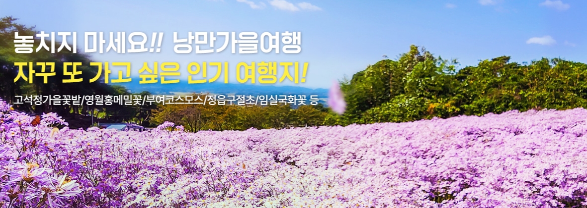 쌀쌀한 바람이 불어오기 시작하는 가을이 되면 괜히 어디론가 훌쩍 떠나고 싶어지잖아요. 그럴 땐 '낭만 가을 여행' 상품들을 살펴보면 좋아요. 가을에만 볼 수 있는 아름다운 풍경을 자랑하는 고석정이나, 드넓게 펼쳐진 영월의 홍메밀꽃밭, 그리고 부여의 코스모스까지, 이름만 들어도 설레는 곳들이 가득합니다.