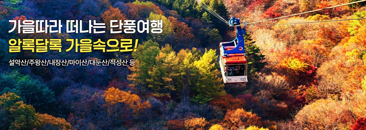 우리나라의 가을이 아름다운 가장 큰 이유 중 하나는 바로 알록달록하게 물드는 단풍이죠. 이 멋진 풍경을 놓치고 싶지 않다면 '가을 단풍 여행' 상품을 주목해야 합니다. 단풍으로 유명한 설악산, 내장산, 마이산 같은 전국의 유명한 산으로 떠나는 여행이 정말 많아요.