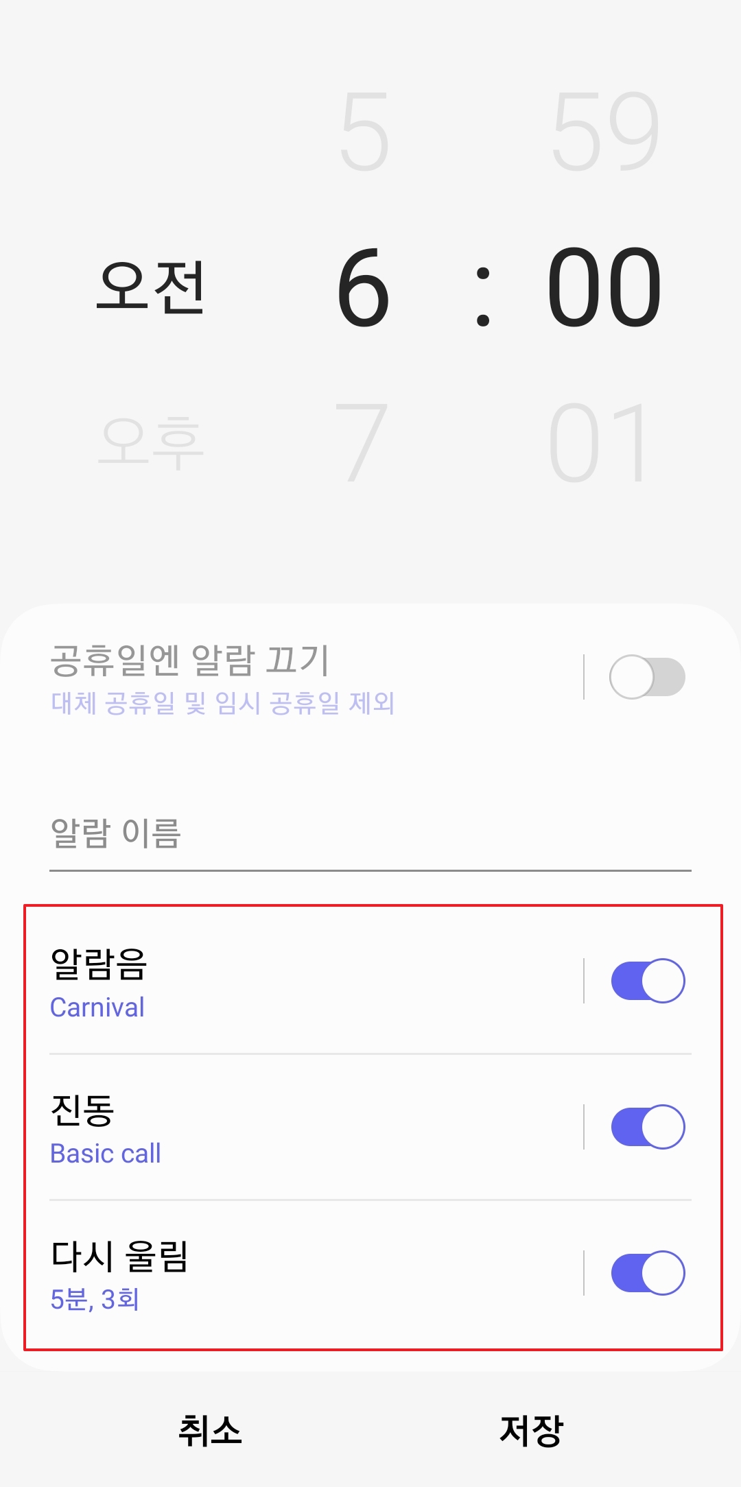 이걸 켜두면 달력에 빨간 날로 표시된 공휴일에는 귀찮게 직접 끄지 않아도 알람이 저절로 울리지 않아요. 다만, 가끔 있는 대체공휴일이나 임시공휴일은 아직 인식을 못해서 울릴 때가 있으니 이 점은 조금 아쉬운 부분이에요.