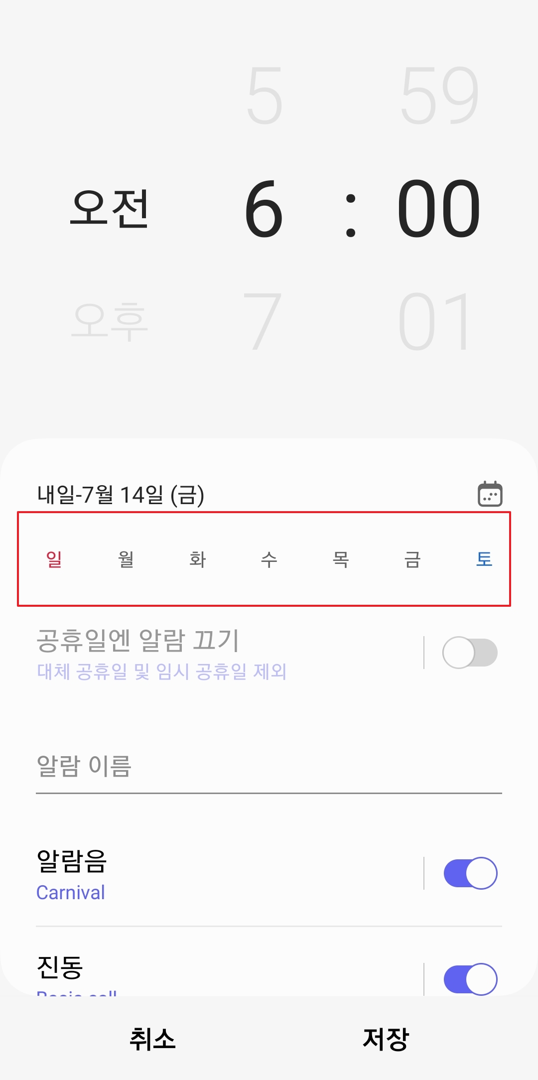 알람을 언제 울리게 할지 정할 때, 요일을 선택하는게 정말 중요해요. 매일 아침 일어나야 하는 학생이나 직장인이라면 월화수목금 이렇게 평일만 선택해두면 아주 편하거든요. 그리고 진짜 좋은 기능이 바로 공휴일에는 알람 끄기 기능이에요.