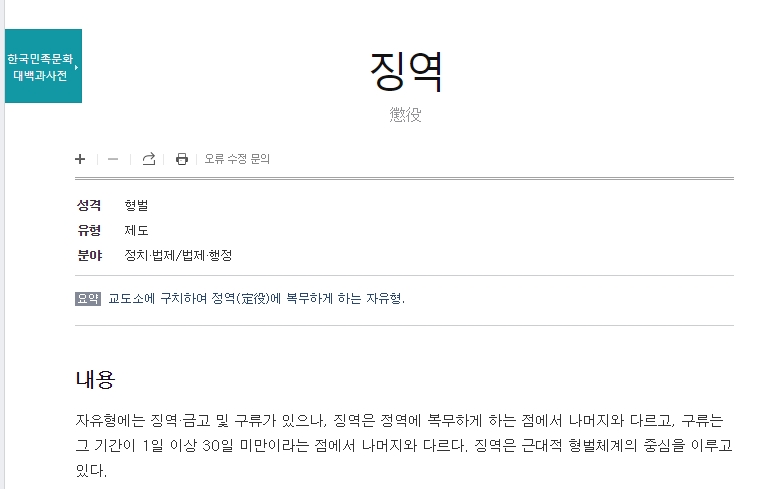 검색창에 징역이랑 집행유예를 각각 쳐서 그 뜻을 살펴보는 거예요. 먼저 징역이라는 건 교도소에 갇혀서 정해진 일을 해야 하는 벌을 말해요. 그냥 가만히 갇혀만 있는 게 아니라 일을 해야 한다는 점에서 다른 벌들이랑 좀 다르죠.