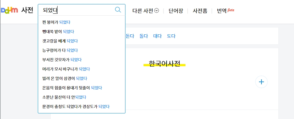 되와 돼의 차이를 알아보기 위해 먼저 다음사전에 접속합니다. 이곳에서는 어학사전, 영어, 영영, 국어, 한자, 일본어, 중국어 사전, 번역, 맞춤법 검사기 등을 제공합니다.