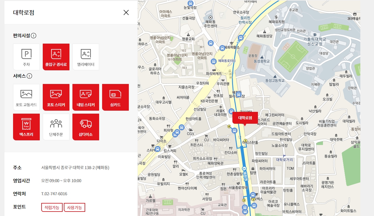 검색 결과에 여러 지점이 나왔는데, 그중에서 대학로점을 선택해서 클릭해봤어요. 이런 식으로 여러 지점을 비교해서 볼 수도 있답니다.
