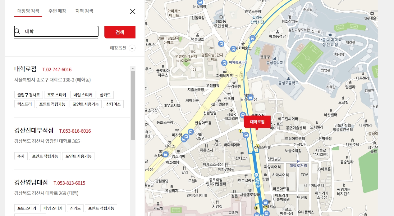 혹시나 다른 매장은 다를 수도 있으니 한번 더 확인해보기로 했어요. 이번에는 대학로에 있는 다이소를 찾아보기 위해 '대학'이라고 검색을 해봤습니다.