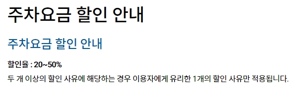주차요금 할인 안내는 다음과 같습니다. 주차요금 할인율은 20%에서 50%까지 적용되며, 두 개 이상의 할인 사유에 해당하는 경우 이용자에게 유리한 한 가지 할인 사유만 적용됩니다.