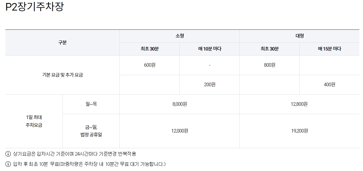 다음으로 P2 장기주차장의 요금 체계입니다. 소형차의 경우, 최초 30분은 600원이 부과되며, 이후 매 10분마다 200원의 추가 요금이 발생합니다. 대형차는 최초 30분에 800원이 부과되며, 이후 매 15분마다 400원의 추가 요금이 발생합니다. 1일 최대 주차 요금은 월요일부터 목요일까지는 8,000원, 금요일부터 일요일 및 법정 공휴일에는 12,000원입니다. 대형차의 경우, 1일 최대 주차 요금은 월요일부터 목요일까지는 12,800원, 금요일부터 일요일 및 법정 공휴일에는 19,200원입니다. 이 주차장 역시 입차 후 최초 10분은 무료로 제공되며, 마중 차량은 주차장 내에서 10분간 무료 대기가 가능합니다.