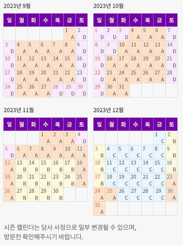 예를 들어 12월의 요금 캘린더를 살펴보면, 크리스마스 연휴나 주말처럼 사람이 많이 찾는 날은 C 또는 D 시즌 요금이 적용되는 것을 확인할 수 있습니다. 반면, 상대적으로 방문객이 적은 평일에는 A 또는 B 시즌의 저렴한 요금이 책정되어 있습니다.