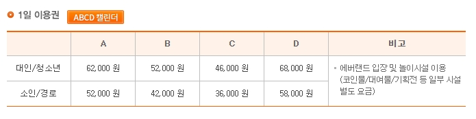 에버랜드 1일 이용권의 가격은 고정되어 있지 않고, 방문객이 몰리는 정도에 따라 유동적으로 변동됩니다. 이를 A, B, C, D 시즌 캘린더 시스템이라고 부릅니다. 보통 D가 공휴일이나 주말 등 가장 방문객이 많은 날의 요금이며, A로 갈수록 상대적으로 저렴해집니다.