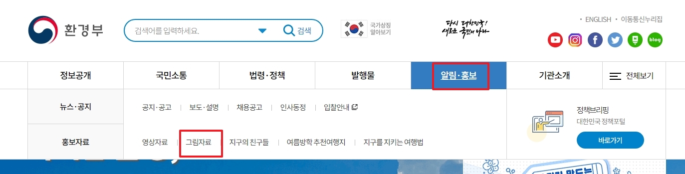 화면 상단의 여러 메뉴 중에서 '알림/홍보'라는 항목을 찾아보세요. 이곳에는 환경과 관련된 새로운 소식이나 유용한 정보들이 가득하답니다. 이 메뉴에 마우스를 올리면 하위 메뉴가 나타나는데, 그중에서 '그림자료'를 선택하면 됩니다.