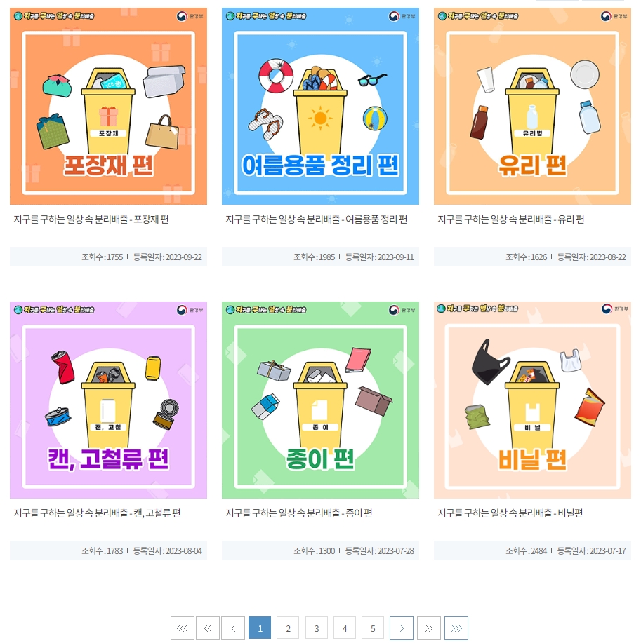 그림자료 게시판으로 이동하면, 복잡할 수 있는 환경 정보를 이해하기 쉬운 카드뉴스 형태로 제공하고 있습니다. 글과 그림이 함께 있어 아이들도 재미있게 볼 수 있답니다. 여기서 우리가 찾는 분리배출에 대한 정보를 검색해 보겠습니다.
