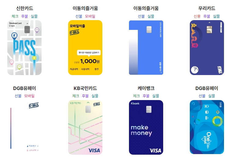 K패스 카드는 총 23개의 카드가 있으며, 각 카드사별로 개별 신청을 해야 합니다. 카드는 실물 카드와 모바일 카드로 나뉘며, 체크카드와 신용카드로도 구분됩니다. 또한, 선불 카드와 후불 카드가 있으므로, 본인의 필요에 따라 선택하여 발급받으면 됩니다.