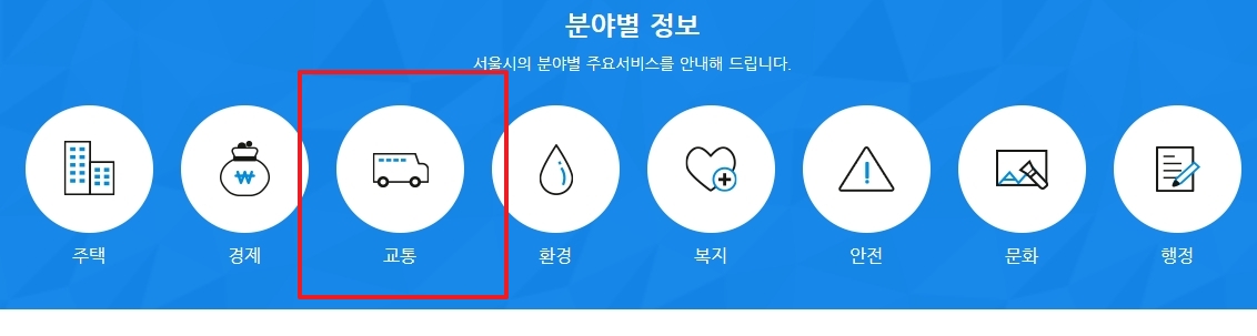 상단의 메뉴에서 분야별정보를 클릭하고, 교통 카테고리를 선택하여 관련 정보를 탐색합니다.