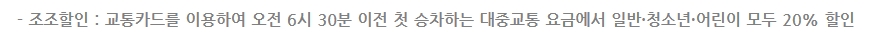 조조할인은 교통카드를 이용하여 오전 6시 30분 이전에 첫 승차하는 대중교통 요금에서 일반, 청소년, 어린이 모두 20% 할인이 적용됩니다